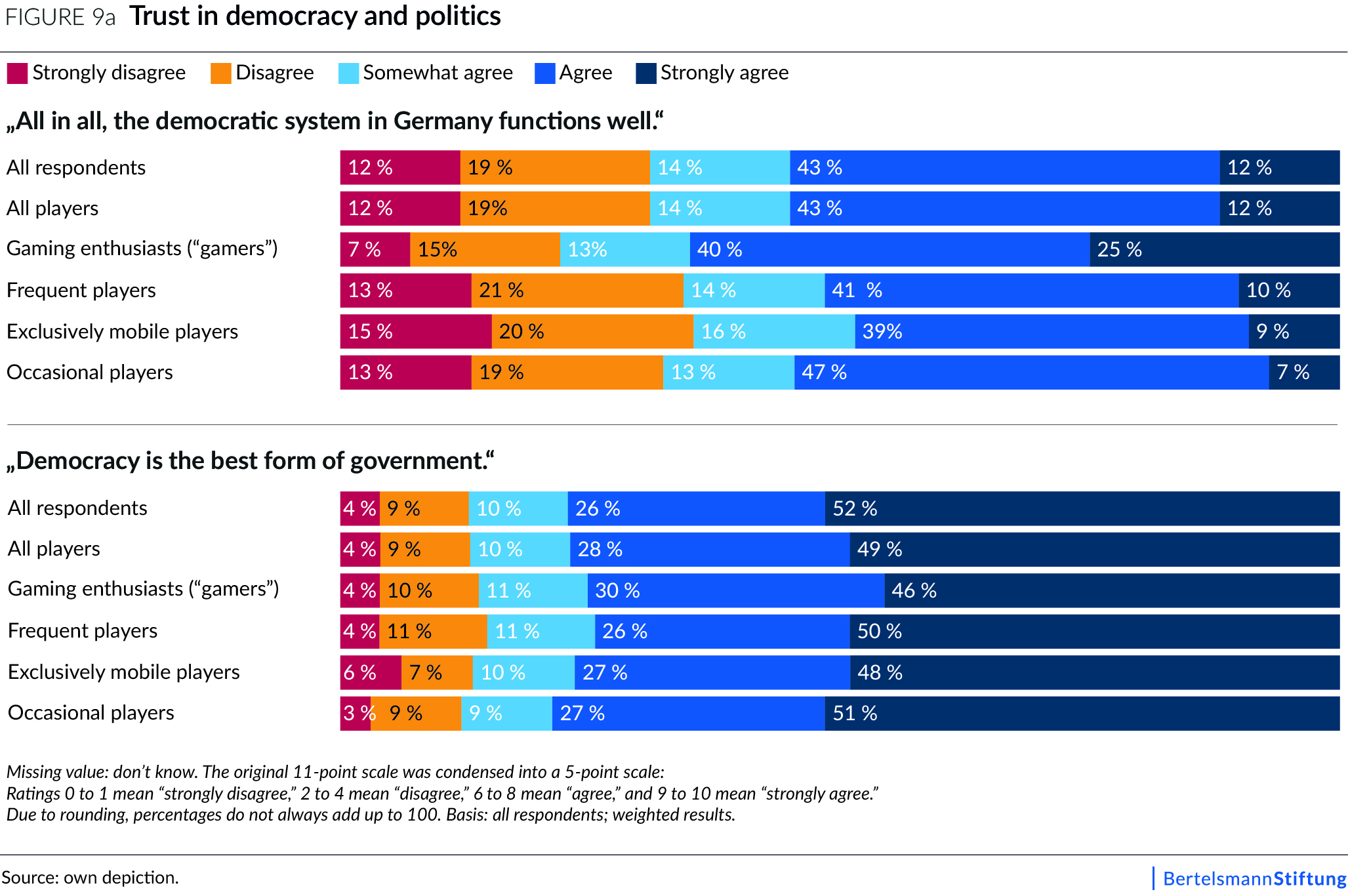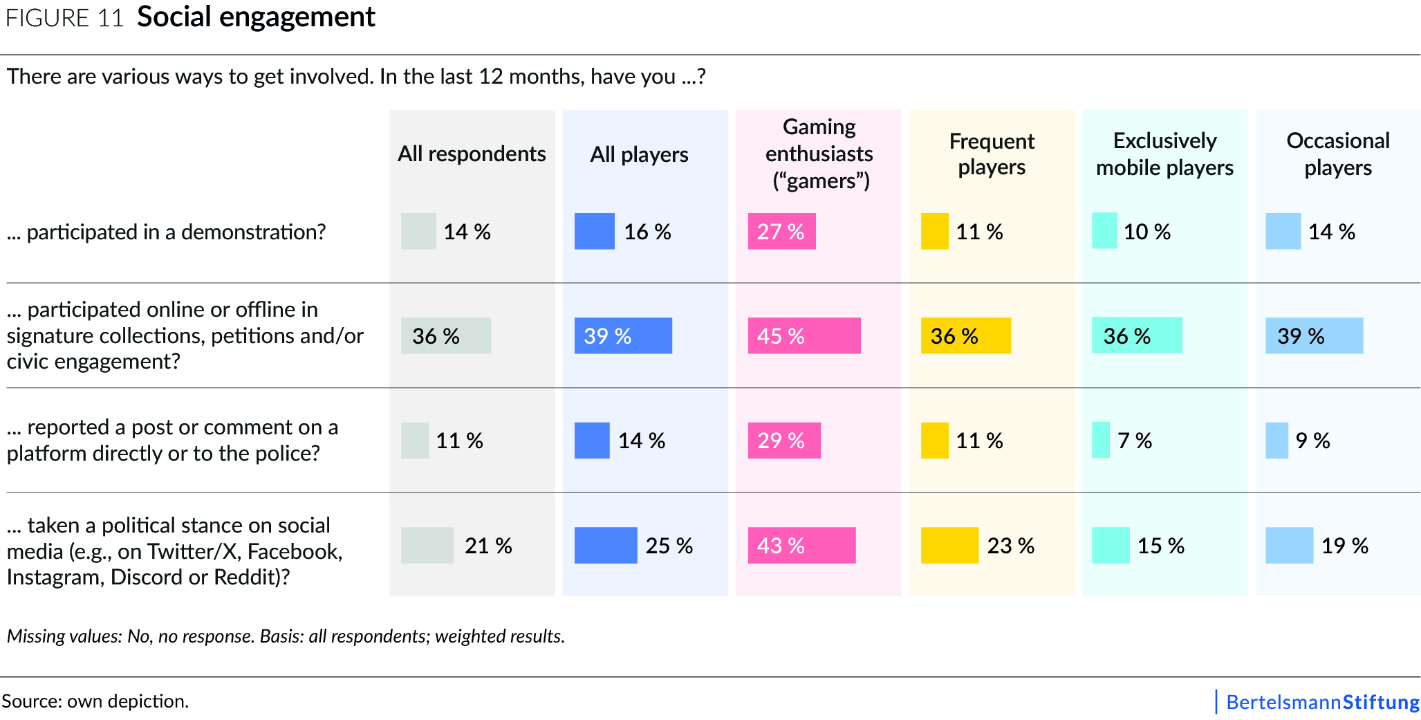 One finding of the study is that players of digital games show a willingness to engage in social and political issues at a level similar to that of the average of all respondents. It is noteworthy that those who play a lot and would describe themselves as “gamers” are more likely than average to participate in democratic processes. For example, 45 percent of this group of “gaming enthusiasts” say they actively participated in democratic processes (e.g., signing petitions or other forms of civic engagement) in the past 12 months. This means that they were more active than the population as a whole (39 percent) The gap is even wider when it comes to making political comments on social media channels (43 percent vs. 25 percent) and participating in demonstrations (27 percent to 14 percent).
